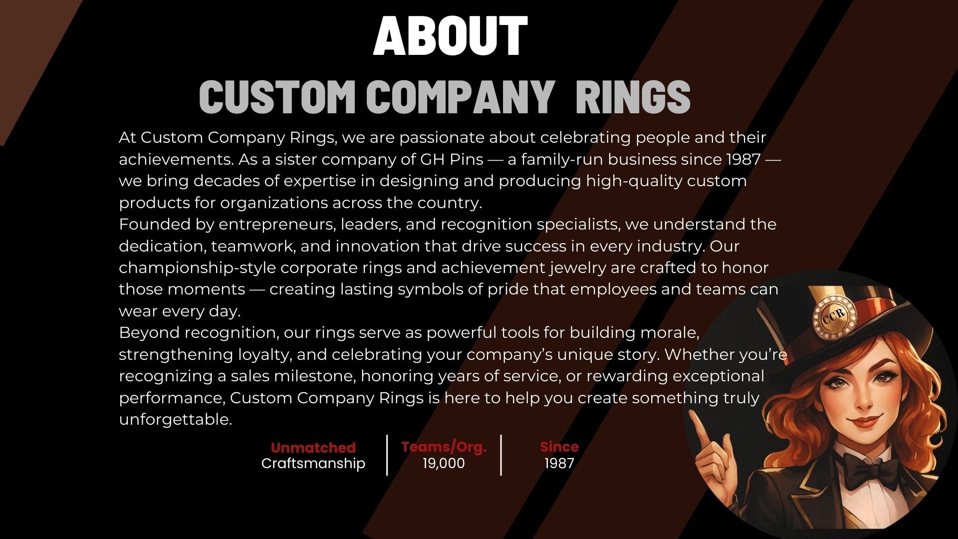 At Custom Company Rings, we design and craft premium corporate rings and achievement jewelry that honor milestones, inspire pride, and leave a lasting impression